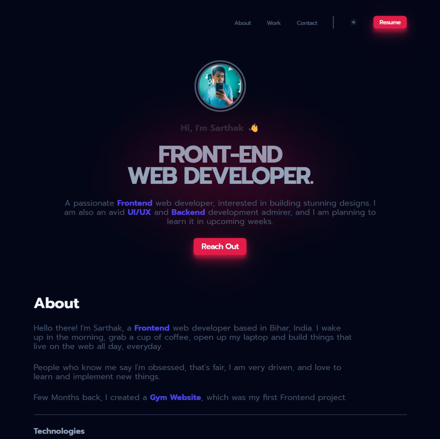 Hello there! I'm Sarthak, a Frontend web developer based in Bihar, India. I wake up in the morning, grab a cup of coffee, open up my laptop and build things that live on the web all day, everyday.